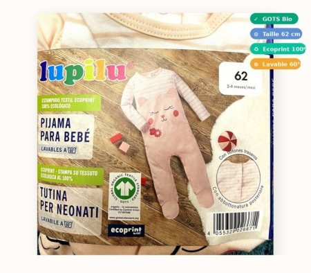 Ce pyjama est en taille 62 (2-4 mois). Il est fabriqué en coton biologique certifié GOTS et utilise la technologie Ecoprint 100% écologique.